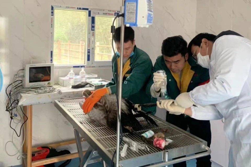 2020年秋季,西宁野生动物园的工作人员在救助落单的黑颈鹤。新华社发