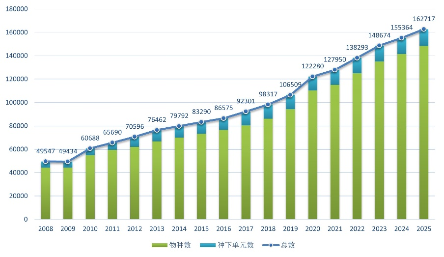 2025版名录共收录物种及种下单元162717个,较2024版新增物种及种下单元7353个。其中,动物界新增4994个物种和470个种下单元,植物界新增458个物种,减少5个种下单元,真菌界新增1405个物种和31个种下单元。
