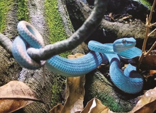 结合盖瑞一身亮眼的碧蓝皮肤、醒目的黄色眼睛,即便少了尾尖砖红色的标志性特征,但李颖超综合其外形与技能判断,盖瑞大概率是一条蓝色变种“海岛竹叶青”。这类蛇主要分布于印度尼西亚科莫多群岛,属于蝰(kuí)蛇科蝮亚科。