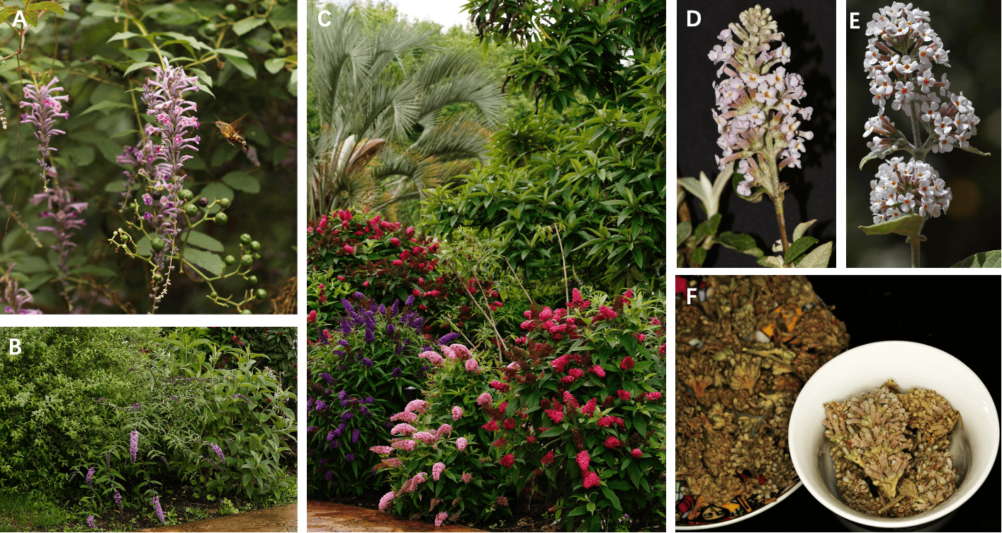 醉鱼草属植物 图版 A:醉鱼草(李润源 摄);B:大叶醉鱼草原种;C:大醉鱼草品种;D:密蒙花(杨丰懋 摄);E:喉药醉鱼草(杨丰懋 摄);F:市场上购买的染饭花,左:喉药醉鱼草,右:密蒙花 (图B、C拍摄于昆明植物园扶荔宫外醉鱼草属植物展示区)