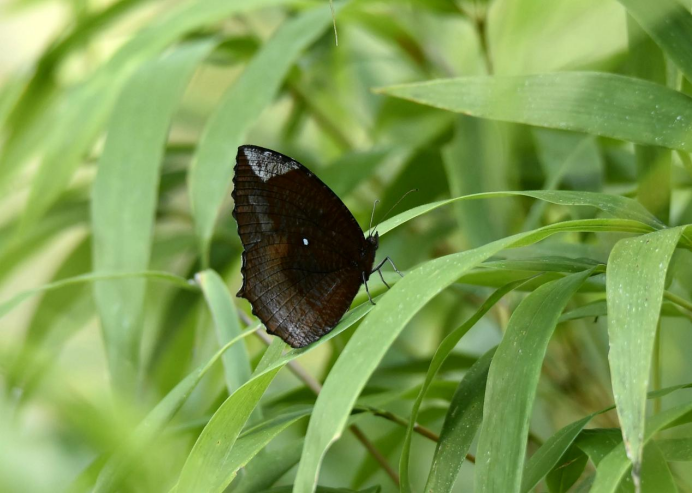 当他们来到保护区的一片四方竹林边缘时,监测人员发现了一只身影独特的蝴蝶在翩翩飞舞,瞬间吸引了众人的目光。这只蝴蝶的腹部花纹似黄钩蛱蝶或美眼蛱蝶,展翅正面闪烁着细小的金斑,犹如大自然赋予的金色勋章。