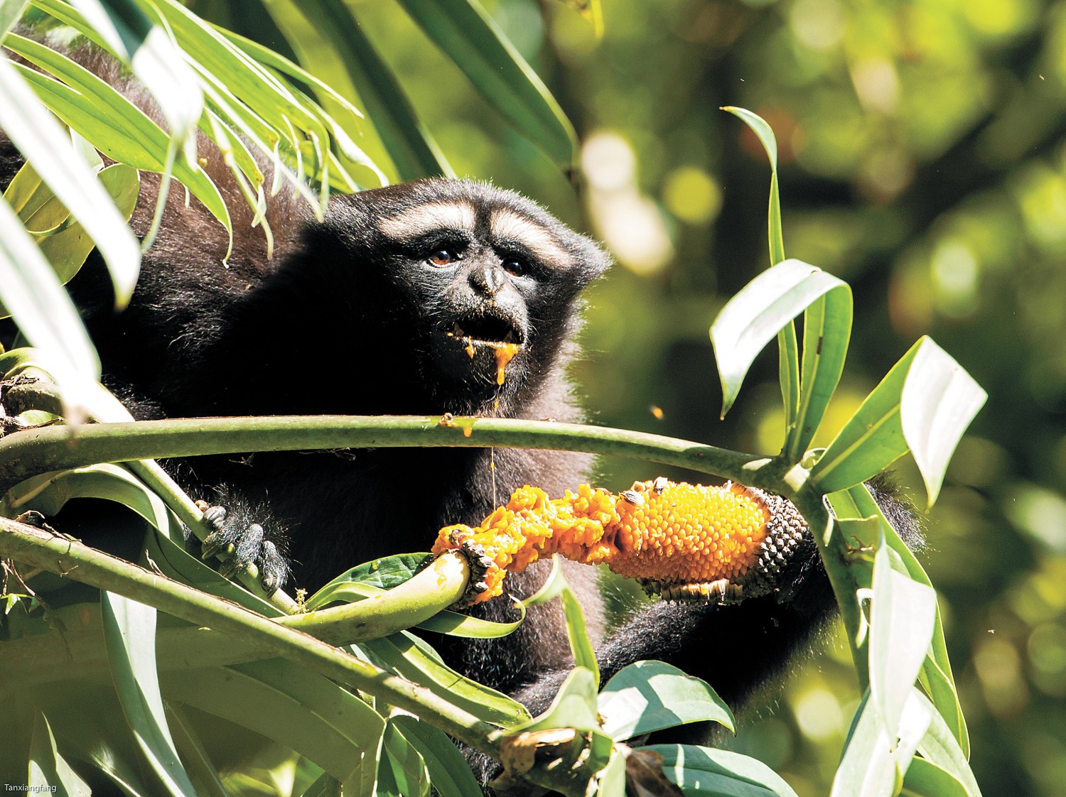 高黎贡白眉长臂猿取食过江龙果实。谭祥芳摄