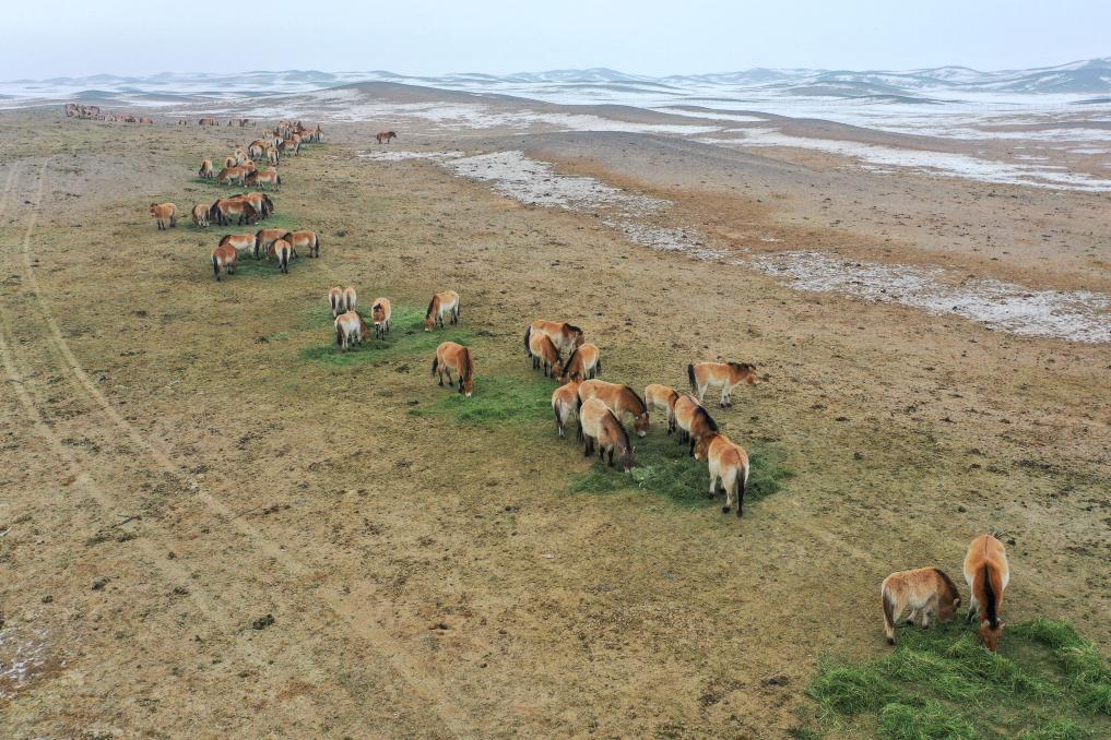 这是在新疆卡拉麦里山有蹄类野生动物自然保护区乔木希拜普氏野马监测站拍摄的普氏野马(2月4日摄,无人机照片)。新华社记者 丁磊 摄