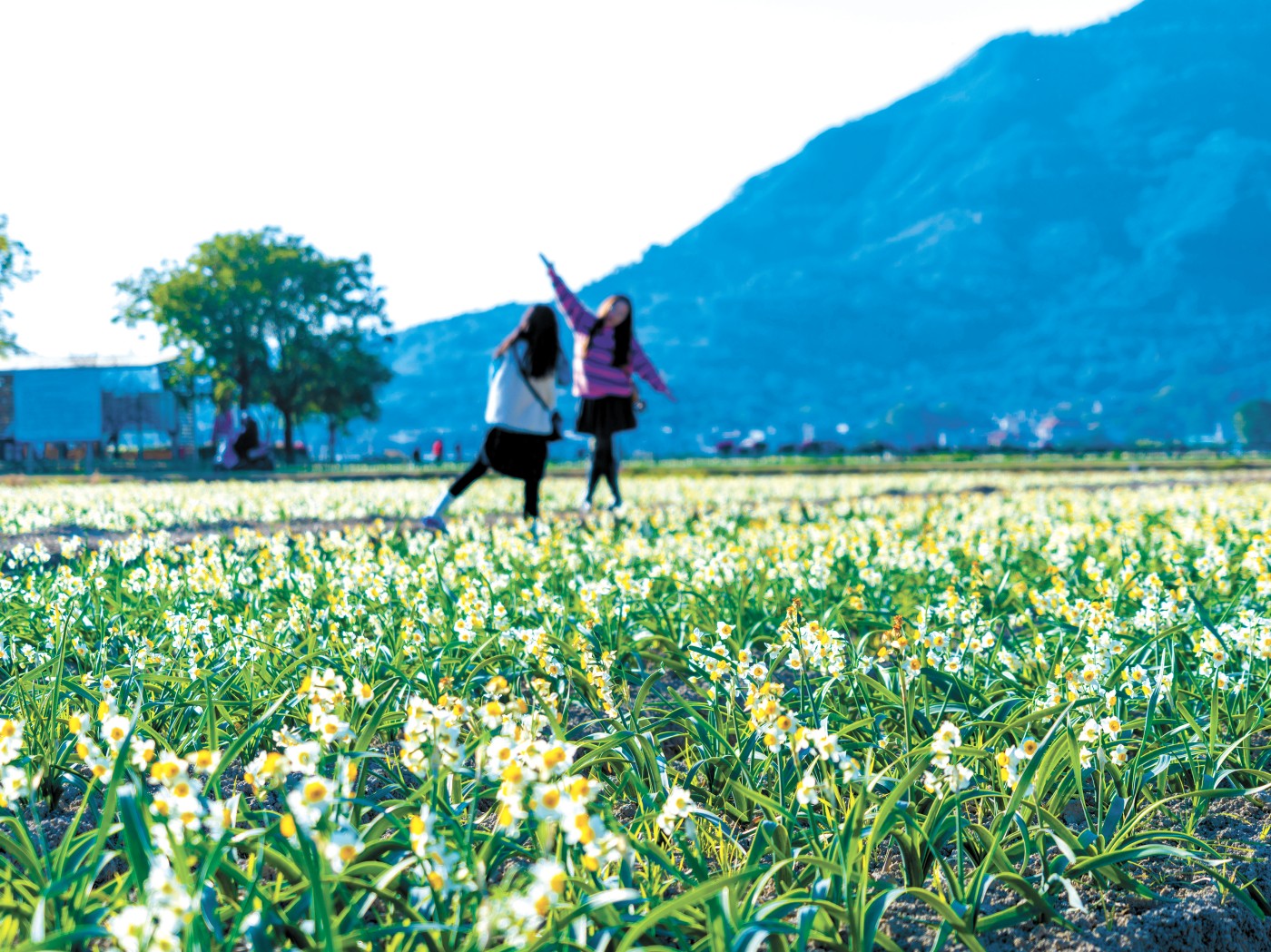近日,福建漳州圆山脚下近6000亩的地栽水仙花海如期盛放,“金盏银台”随风摇曳、清香四溢,吸引了众多市民游客。