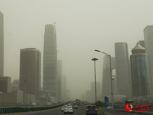 4月11日早晨,北京国贸地区出现沙尘天气。人民网记者 王天乐摄
