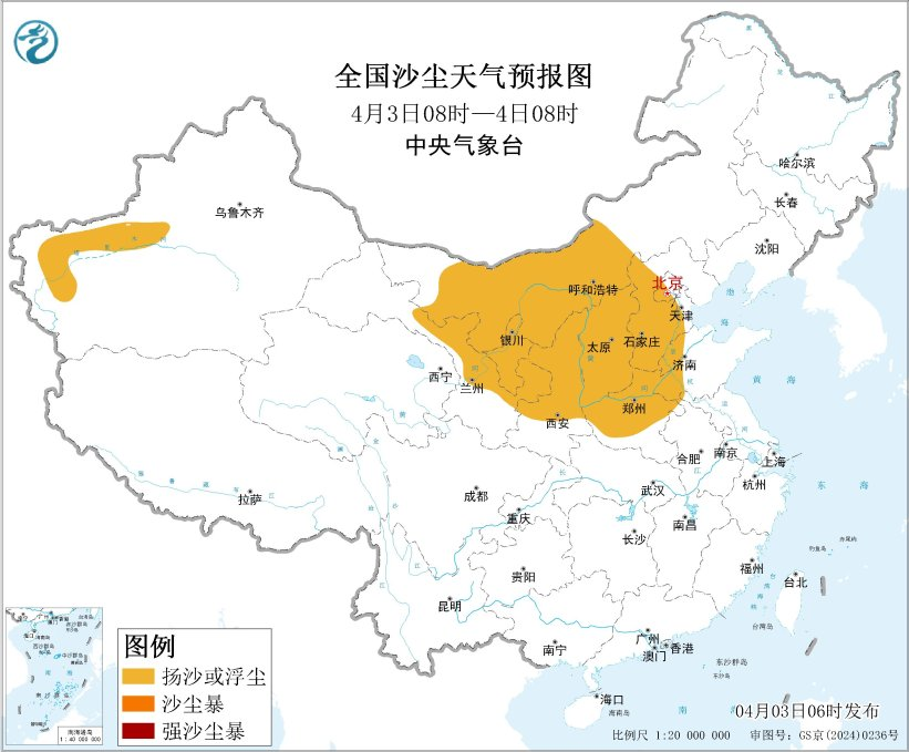 根据中央气象台4月3日06时继续发布的沙尘暴蓝色预警:受冷空气大风影响,预计4月3日08时至4日08时,新疆南部、内蒙古中西部、甘肃中东部和河西、宁夏、陕西中北部、山西、北京西南部、天津西部、河北中南部、河南中北部、山东西部等地的部分地区有扬沙或浮尘天气。
