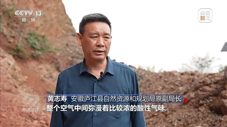 安徽庐江县自然资源和规划局原副局长 黄志寿:治理前寸草不生,蚊虫苍蝇都没有,空气中弥漫着比较浓的酸性气味,水基本上都是酸性的,相当于硫酸,这里的废水流向巢湖和长江,对生态环境的破坏很严重。