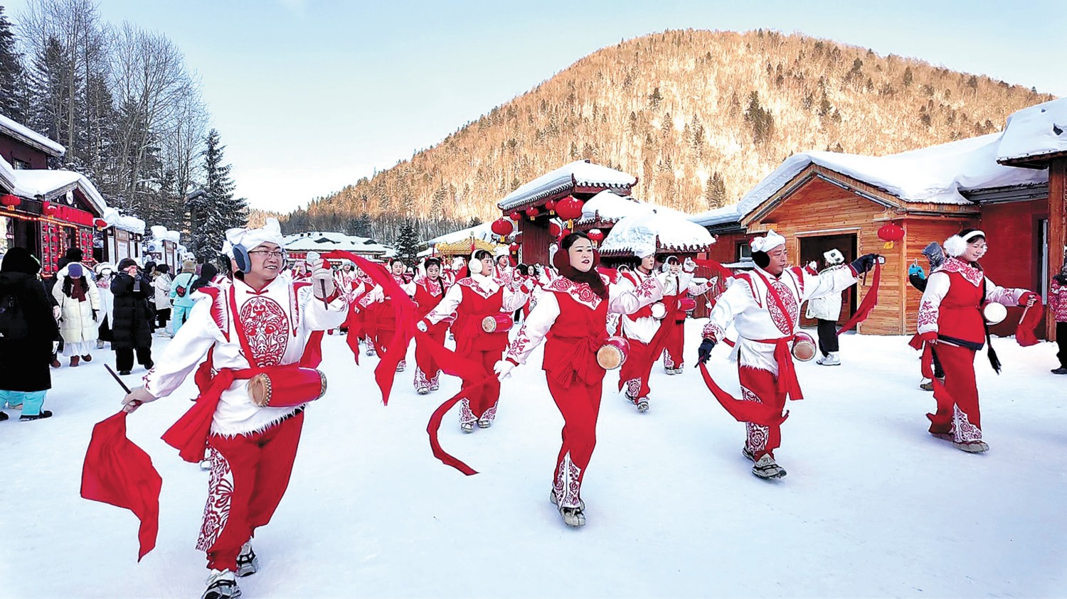 雪韵大街上,舞狮、踩高跷、大花轿、安塞腰鼓、东北大秧歌轮番上演,火红绸带与白雪相映成趣。夜间的雪地蹦迪、烟花秀、激光秀更是点燃了冬日激情。爱心驿站、免费行李托运、“有事找我”等贴心服务,让游客在赏雪乐雪之余倍感雪乡温暖。 (王天驰)