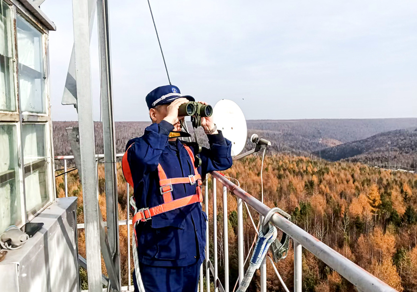 瞭望员在防火塔上时刻守护着茫茫林海。人民网记者 王海跃摄