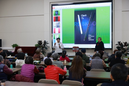 陶旭光现任北京单簧管协会会长、中国歌剧舞剧院国家一级演奏员,在管乐演奏与教学领域造诣深厚;王瀚强老师留学法国,获萨克斯专业博士学位,具有多年音乐普及与教学经验。讲座中,两位老师从电吹管音色丰富、指法通用、易于上手等特点及其对老年人的独特优势入手,系统讲解了乐器功能、操作要领与演奏技巧。讲座最后,两位老师分别运用不同音色精彩演绎了多首经典曲目,将现场气氛推向高潮。在互动环节,老同志在老师指导下亲手试奏,现场配备全新一次性吹嘴,保障卫生安全,零基础学员也能轻松体验吹奏乐趣,现场气氛温馨热烈。