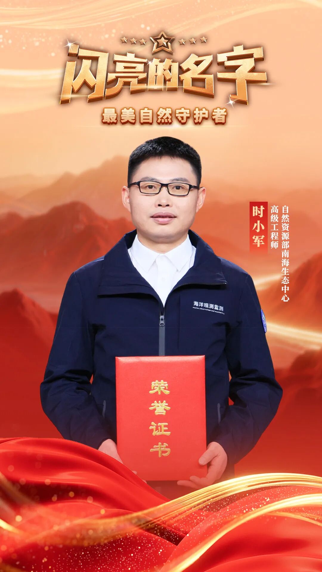 时小军,男,汉族,1982年11月生,中共党员,自然资源部南海生态中心高级工程师。他连续9年率队深入南海岛礁等重点海域开展珊瑚礁生态调查,获取大量基础数据和资料,为南海生态保护与研究作出积极贡献。他牵头建立国内首个珊瑚礁生态数据库和全国珊瑚礁监测监管系统,绘制全国珊瑚礁生态“一张图”,推动研发新型生态预警监测和灾害防控技术,有效促进了珊瑚礁高质量保护。曾获海洋科学技术奖一等奖等荣誉。