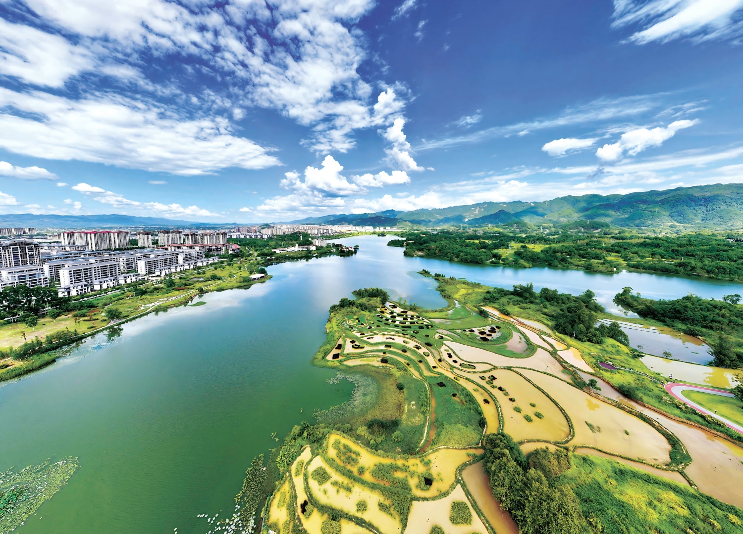 湿地首先是自然之地,然后才是人居之地。双桂湖贴着梁平城,梁平城挨着高梁山,临水而居,山水相依,人鸟共生,天人合一。这是小微湿地的修复与打造,其实也是人活天地间应有的样子。