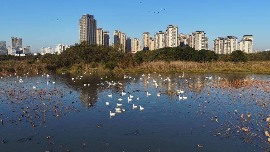 2025年11月20日,位于安徽省池州市主城区的月亮湖湿地迎来近300只小天鹅越冬。饶颐 摄