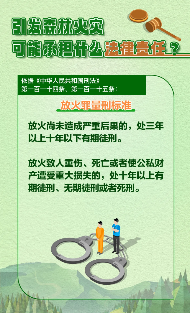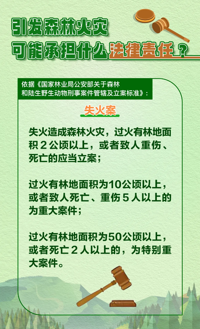 森林火灾突发性强、破坏性大,扑救较为困难,不仅能在短时间内烧毁大量林木,严重破坏森林生态系统和生物多样性,还会威胁人民群众生命财产安全。我国法律法规对涉火违法行为设定了明确且严厉的法律责任。