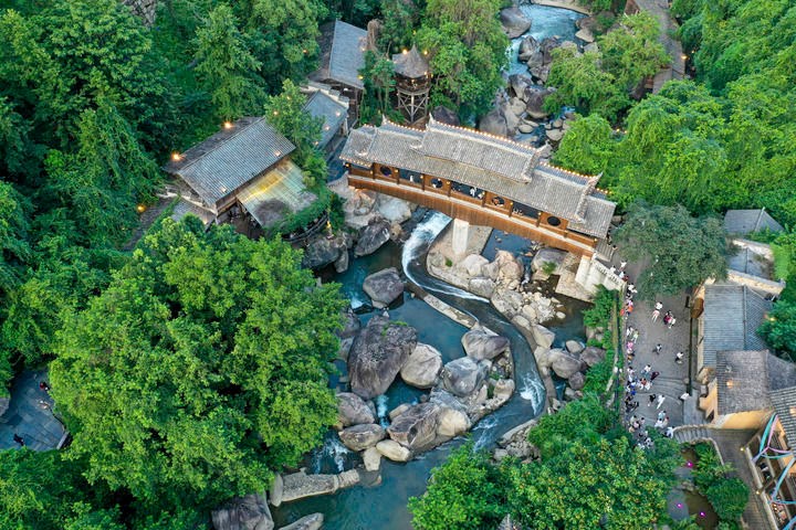 这是2025年7月11日在江西省上饶市广信区望仙乡拍摄的望仙谷景区。望仙谷景区过去曾是花岗岩板材生产基地,长期无序开采导致植被破坏。之后当地政府一次性关闭所有石材加工厂,通过生态修复,将这里打造成一个集山水人文景观、民俗体验、活动演艺于一体的度假旅游区。新华社记者 刘金海 摄