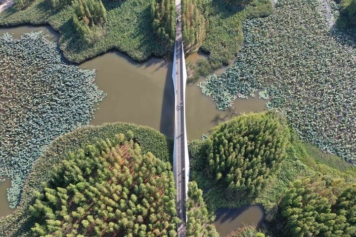 2024年10月3日,游客们正在南昌高新区鱼尾洲公园游玩。鱼尾洲公园是一个由鱼塘和粉煤灰堆积场改造而来的城市湿地公园。新华每日电讯记者周密 摄
