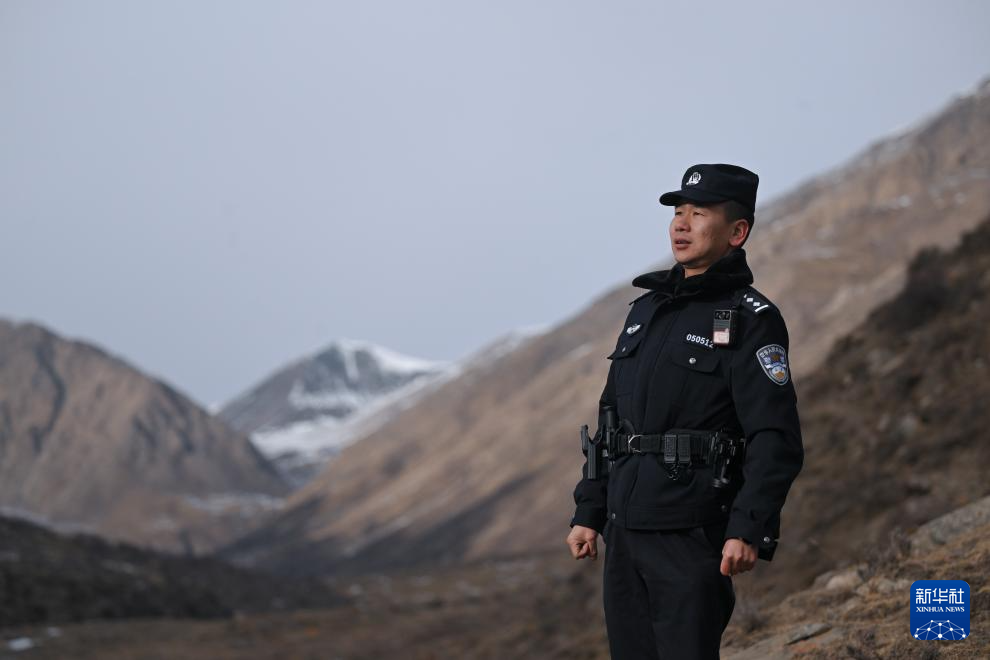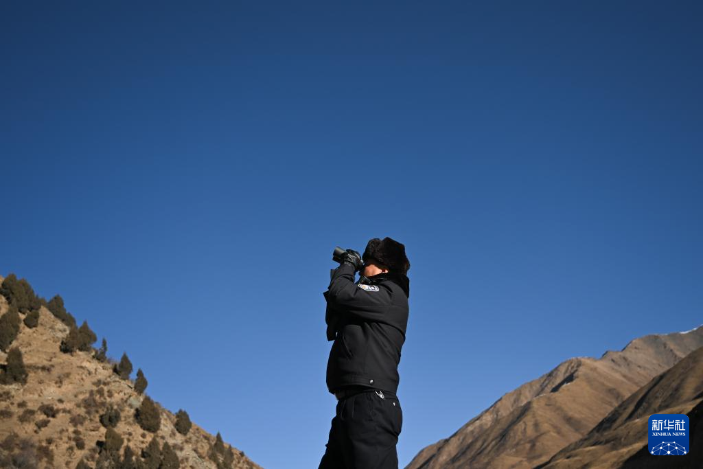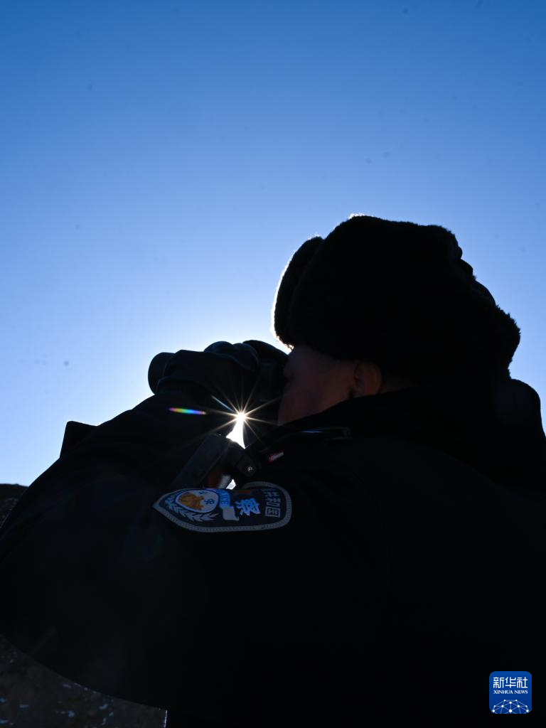 1月9日,在青海省海北藏族自治州门源回族自治县境内的老虎沟,民警郭建业用望远镜查看远处。