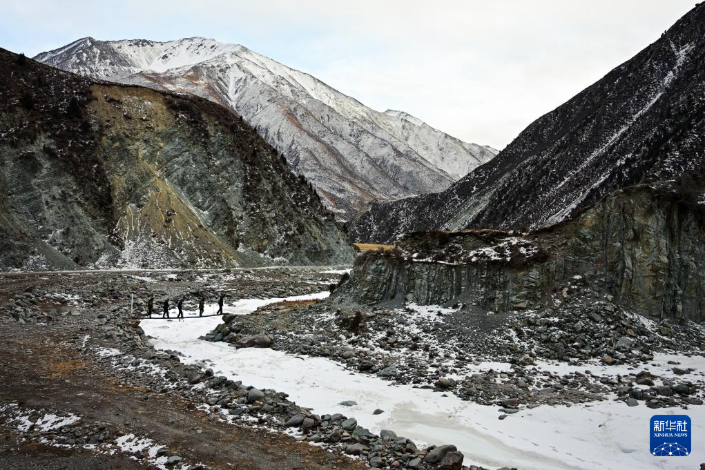 1月8日,在青海省海北藏族自治州门源回族自治县境内的老虎沟,民警和生态管护员在巡护祁连山。