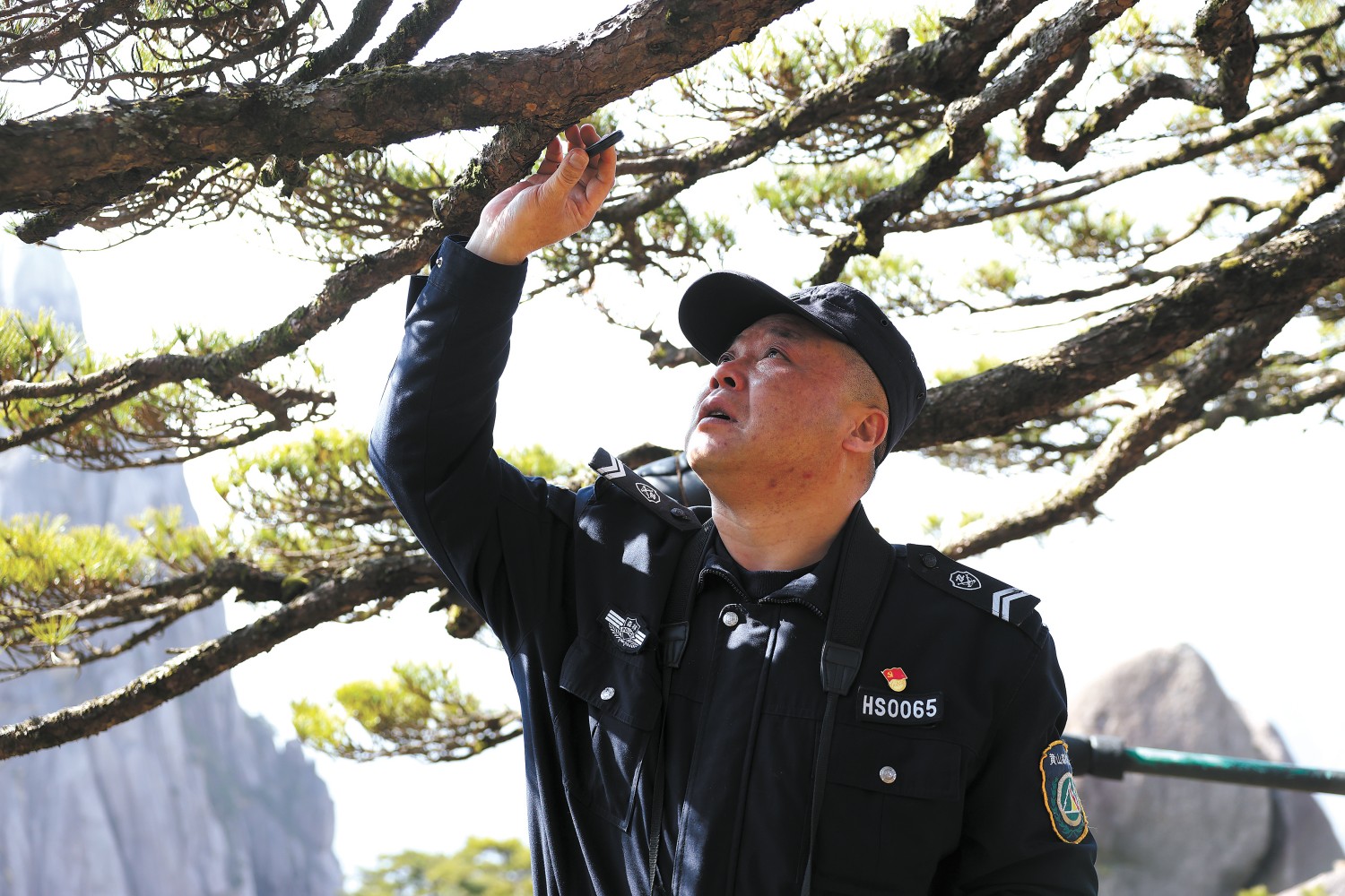 “这份工作很伟大也很光荣,一代代守松人接力守护着迎客松。同时,这份工作说简单也不简单,要不断学习林业知识,悉心记录迎客松变化,为专家团队会诊提供基础数据支撑。”这16年里,胡晓春每年有超过300天住在山上,他手写的《迎客松日记》已有100余本、160多万字。“正常情况下,我们每两个小时巡护一次,对迎客松树体、主干、枝丫枝条、冠幅、支撑架、周边环境等进行巡查,填写《迎客松日记》。遇到恶劣天气,加强巡护频率,确保迎客松万无一失。”谈到迎客松,胡晓春滔滔不绝,在他看来,做好本职工作是最重要的立足点。