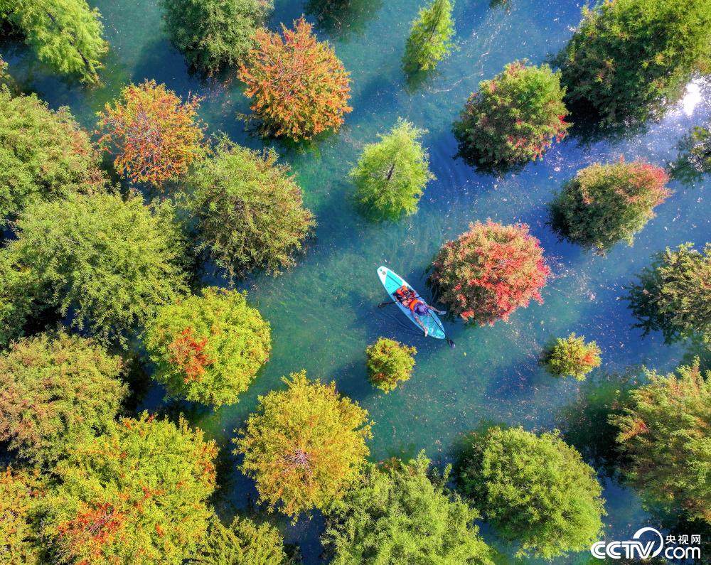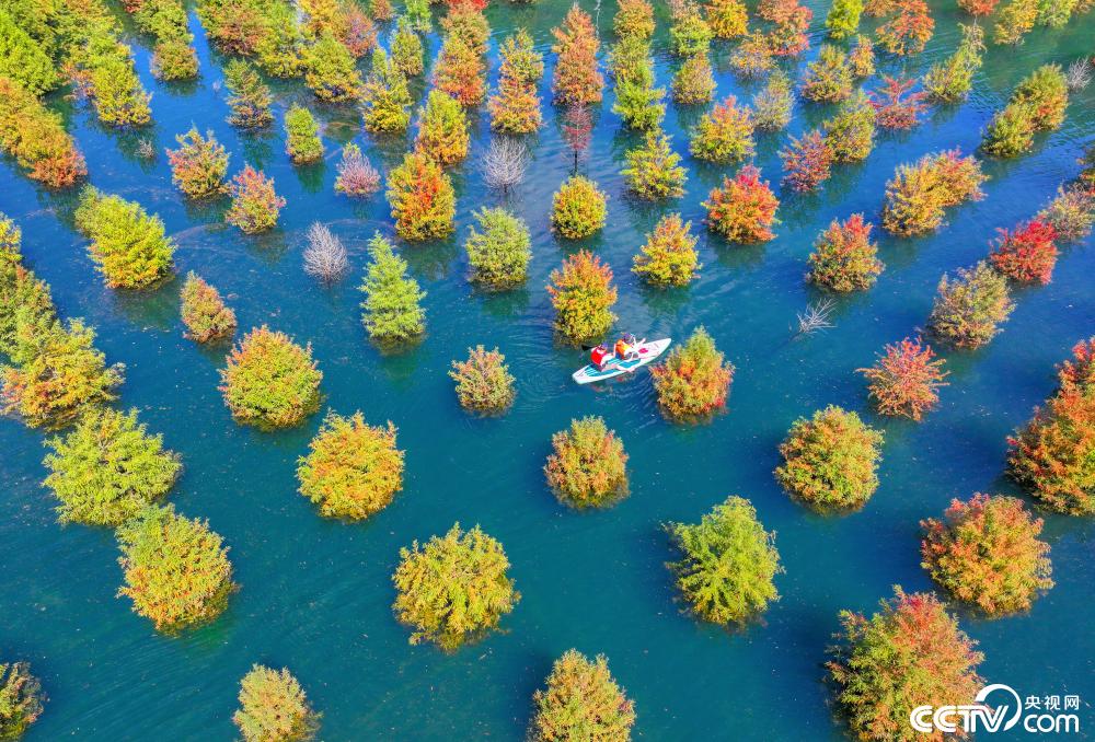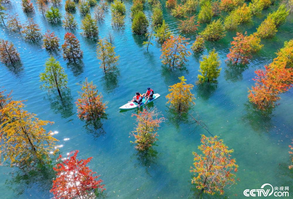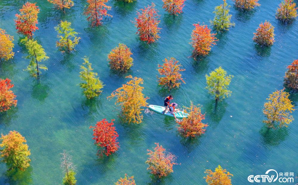 浙江湖州:水杉林叠翠流丹 游客划桨板宛如穿行棋盘