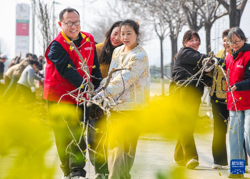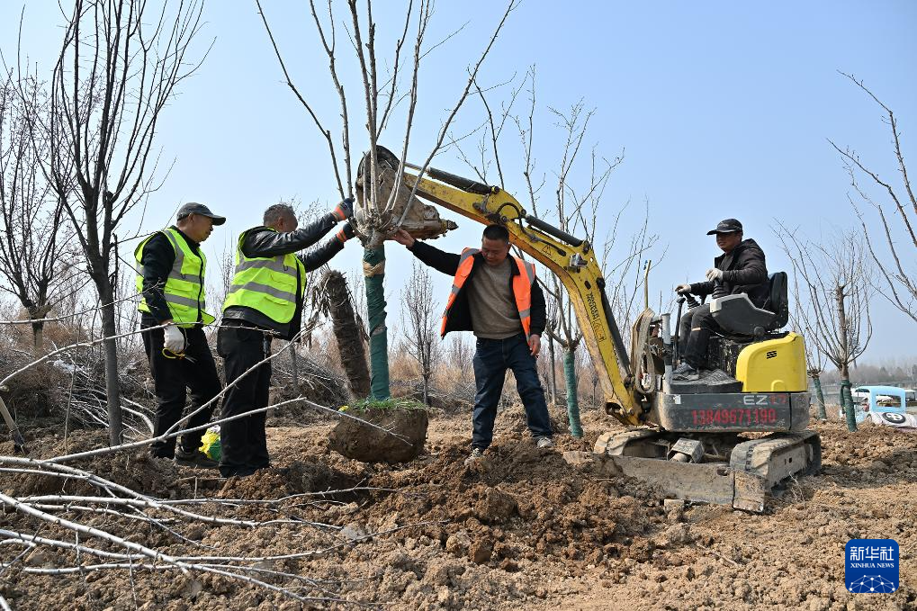 3月11日,工作人员在河南商丘古城植树。