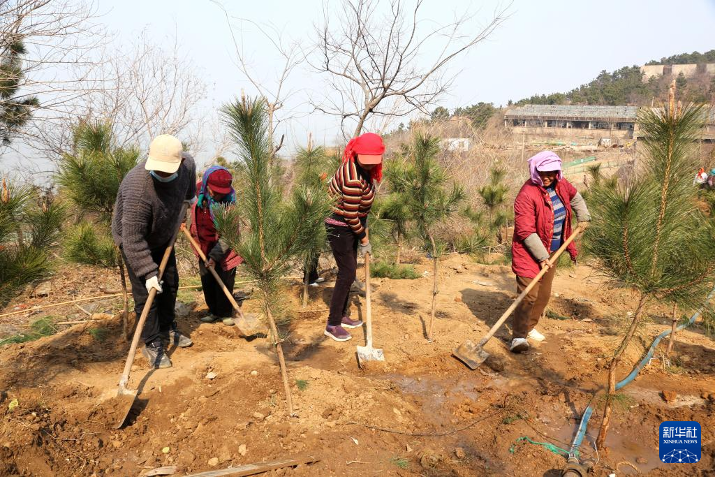 3月10日,工人在江苏省连云港市连云区北固山上参与植树造林。