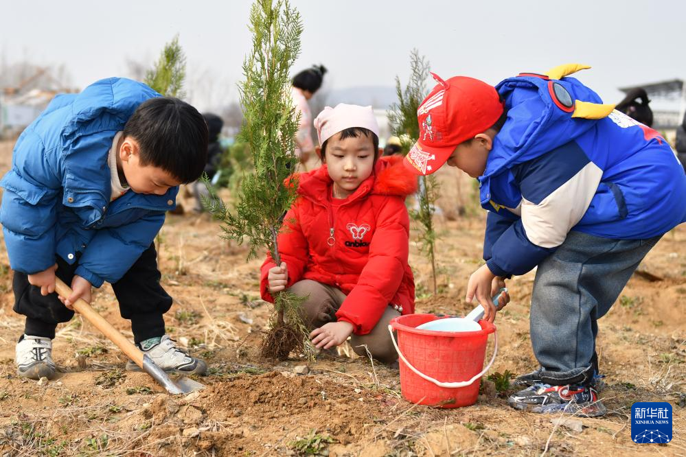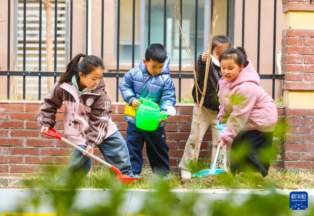 3月11日,在山东省乐陵市幸福一区幼儿园,孩子们在校园里栽种树苗。