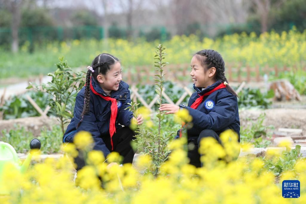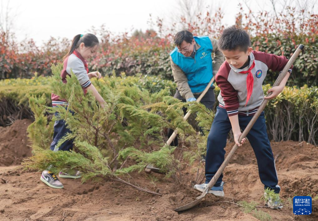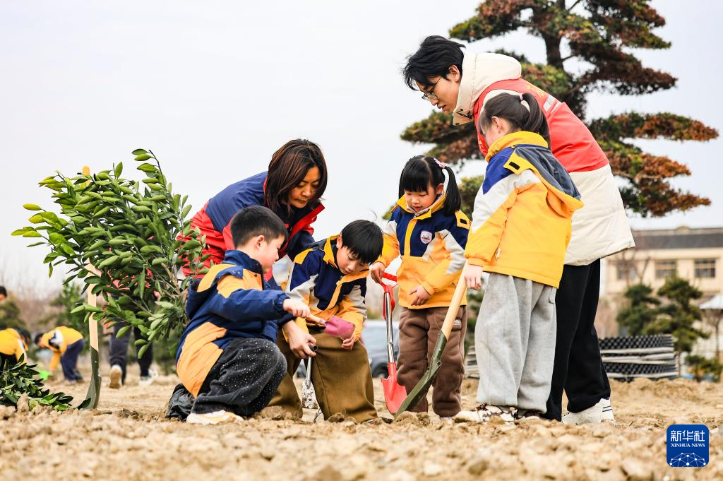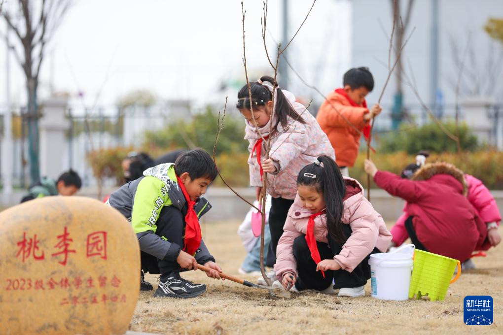 3月11日,学生在江苏省泰州市姜堰区实验小学教育集团城南校区校园内植树。