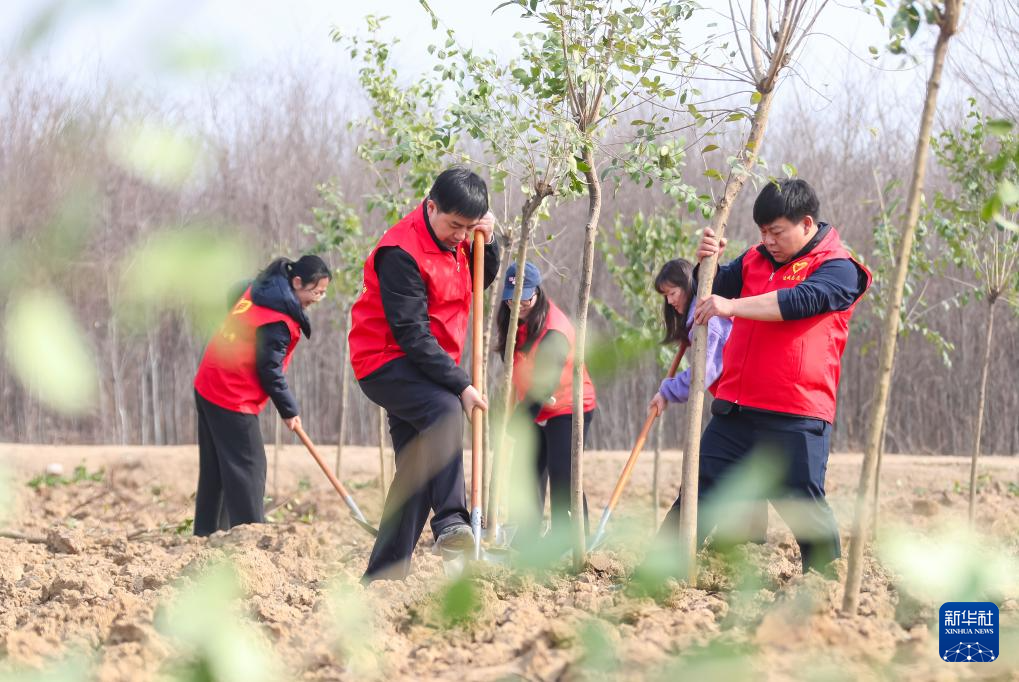 3月11日,在河南省焦作市博爱县柏山镇大中里村,志愿者在种植树苗。
