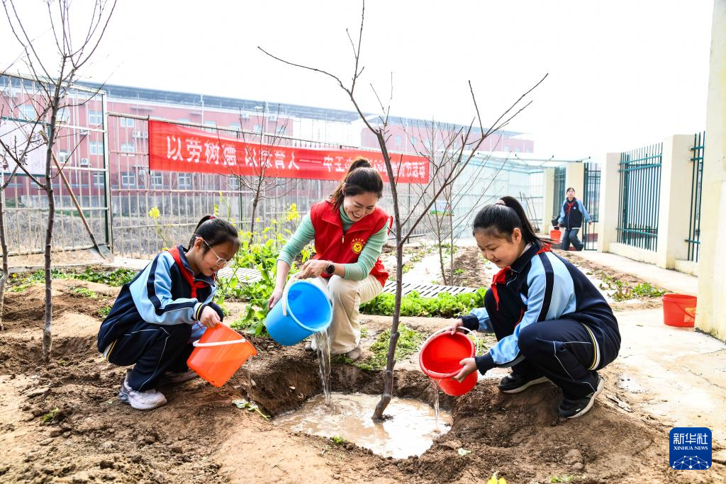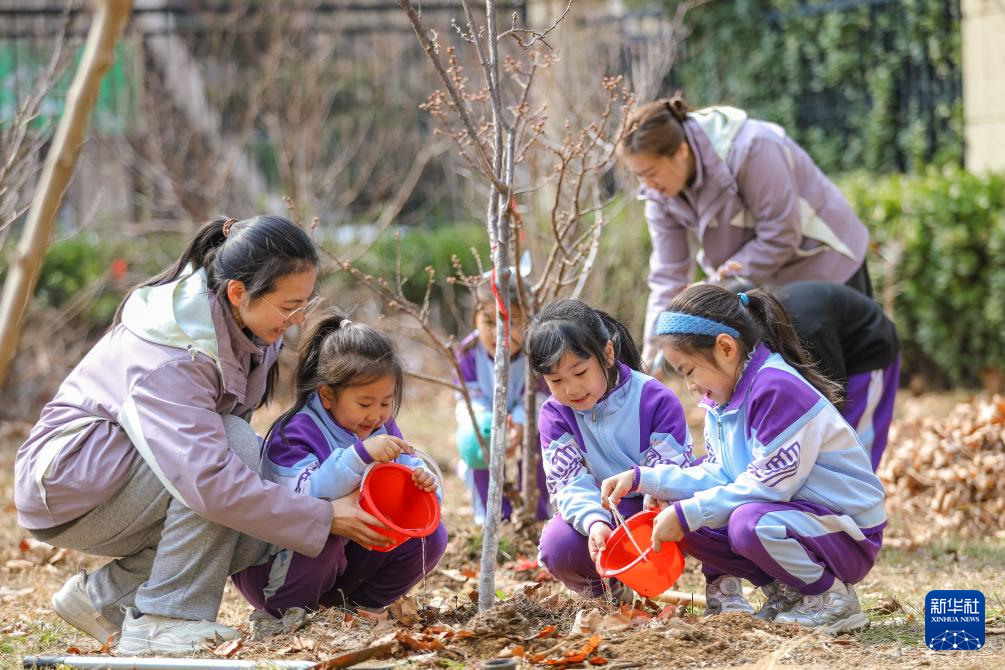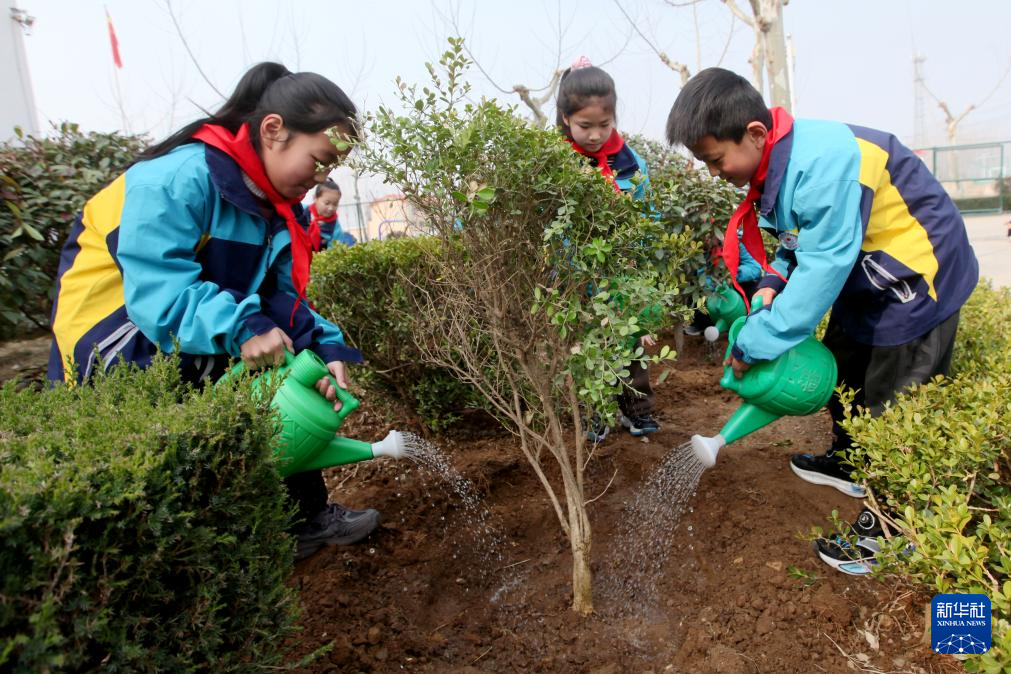 3月11日,在河南省济源市轵城镇中王村中心小学,学生与老师一起为刚栽植的树苗浇水。