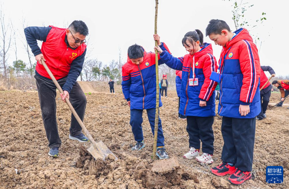3月11日,在江苏省扬州市江都区邵伯镇京杭大运河畔,邵伯中心小学学生和扬州市江都区运河管理处志愿者在植树。