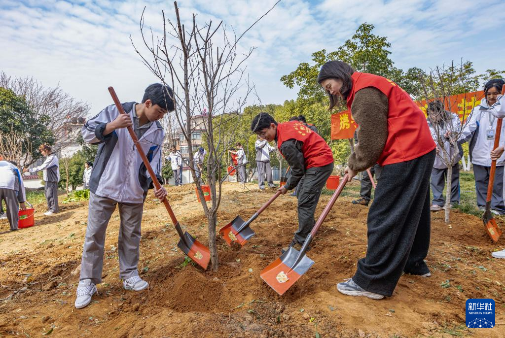 3月11日,在武汉市武昌区滨江实验第一小学,学生、教师和青年志愿者参加义务植树活动。