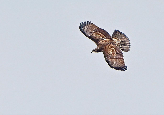 10月11日,调查人员在保护区山顶上进行调查时,被远处山脊上的一场空中追逐所吸引。一只大型鹰类在空中翻飞,却被一只小型鹰类紧紧追逐。两者在空中盘旋、翻滚,仿佛正在上演一场精彩的“空中戏剧”。调查人员迅速按下快门,记录下了这一罕见的珍贵画面。经过仔细观察和鉴定,调查人员发现,小型鹰是红隼,而大型鹰竟然是国家二级重点保护野生动物——凤头蜂鹰,是天宝岩保护区今年新增的第3个鸟类记录种,也是永安市首次对凤头蜂鹰的影像记录。这一发现,不仅丰富了保护区的生物多样性,也为永安市进一步探索研究保护区的生态系统提供了珍贵的资料。