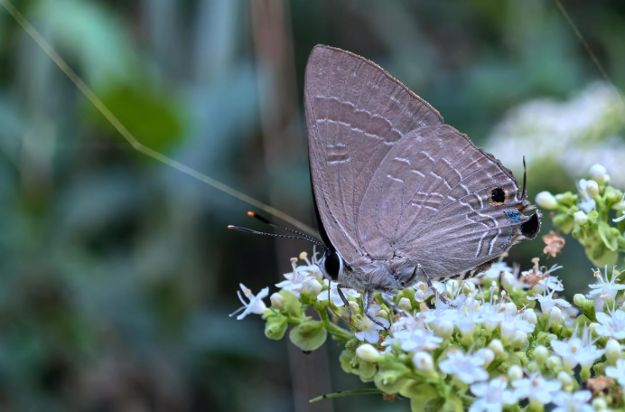 10月8日,保护区调查人员在进行日常资源调查时,意外邂逅了一只正在花丛中翩翩起舞的蝴蝶。这只蝴蝶翅膀在阳光下闪烁着独特的光泽,引起了调查人员的注意。经过仔细观察和鉴定,调查人员惊喜地发现,这只斑纹独特、姿态优雅的蝴蝶竟是保护区的新记录物种——玳灰蝶,是天宝岩保护区今年记录到的第5种新蝴蝶,为保护区的生物多样性增添了新的亮点。