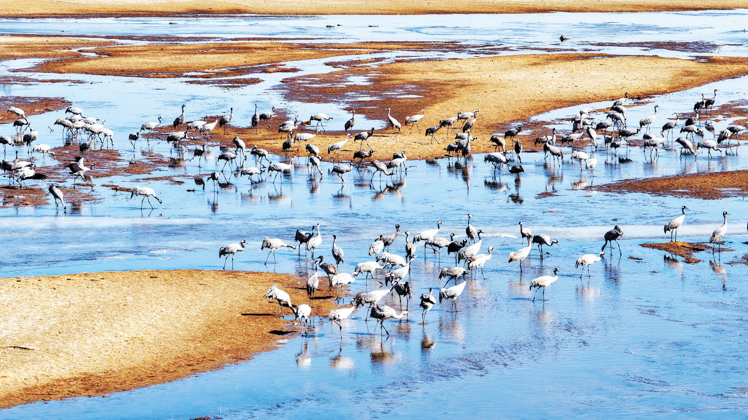 3月,内蒙古自治区赤峰市西拉木伦河巴林右旗段,冰雪初融,碧波漾动。成群的灰鹤、蓑羽鹤等珍稀水鸟如约而至,在浅滩与沙洲间翩跹起舞,勾勒出一幅“鹤舞长河、生机盎然”的生态画卷,成为赤峰市生态保护成效的生动注脚。