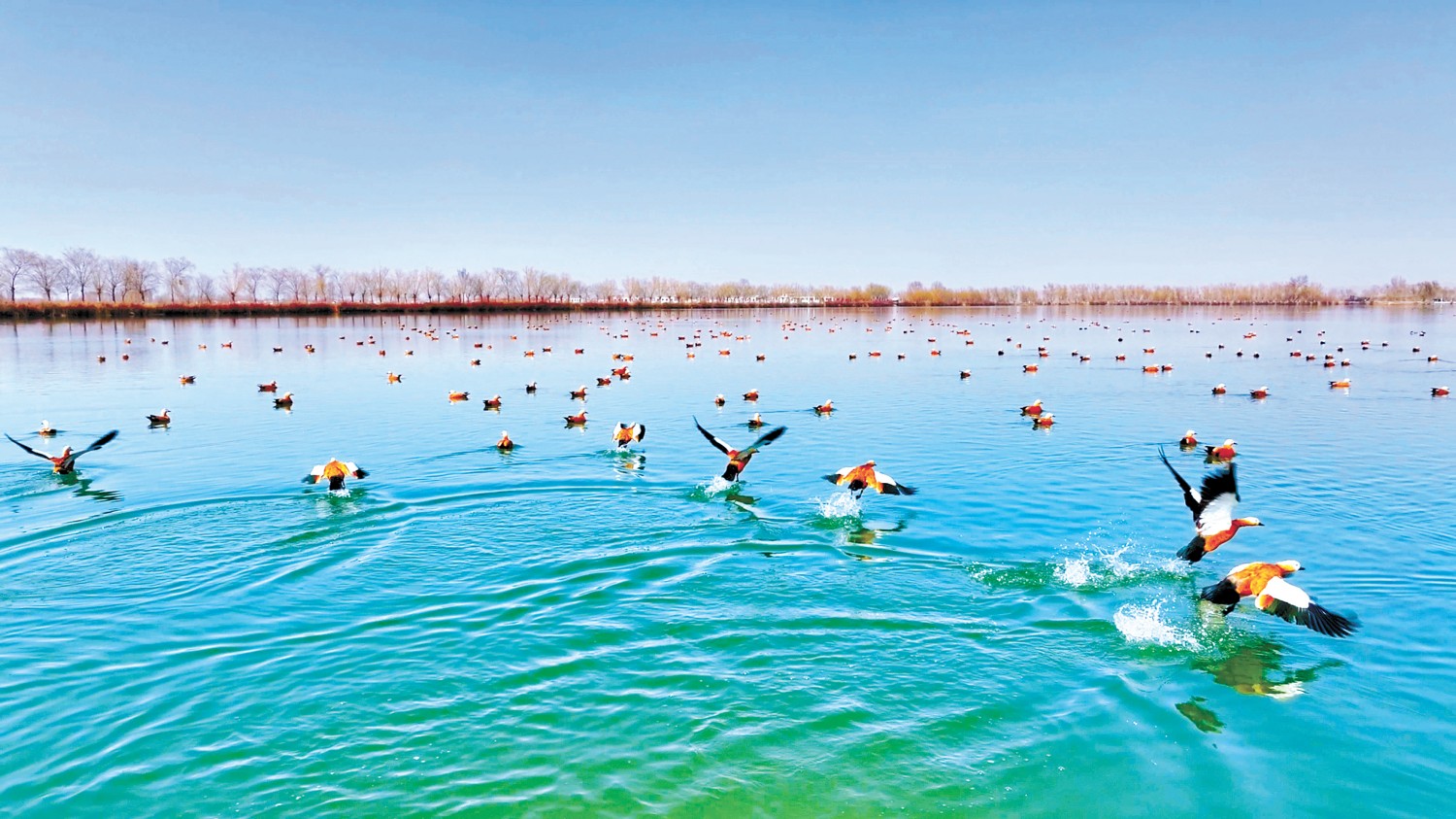 春日的高台大湖湾水域,成群的赤麻鸭、绿头鸭、灰雁等如约而至 段海摄