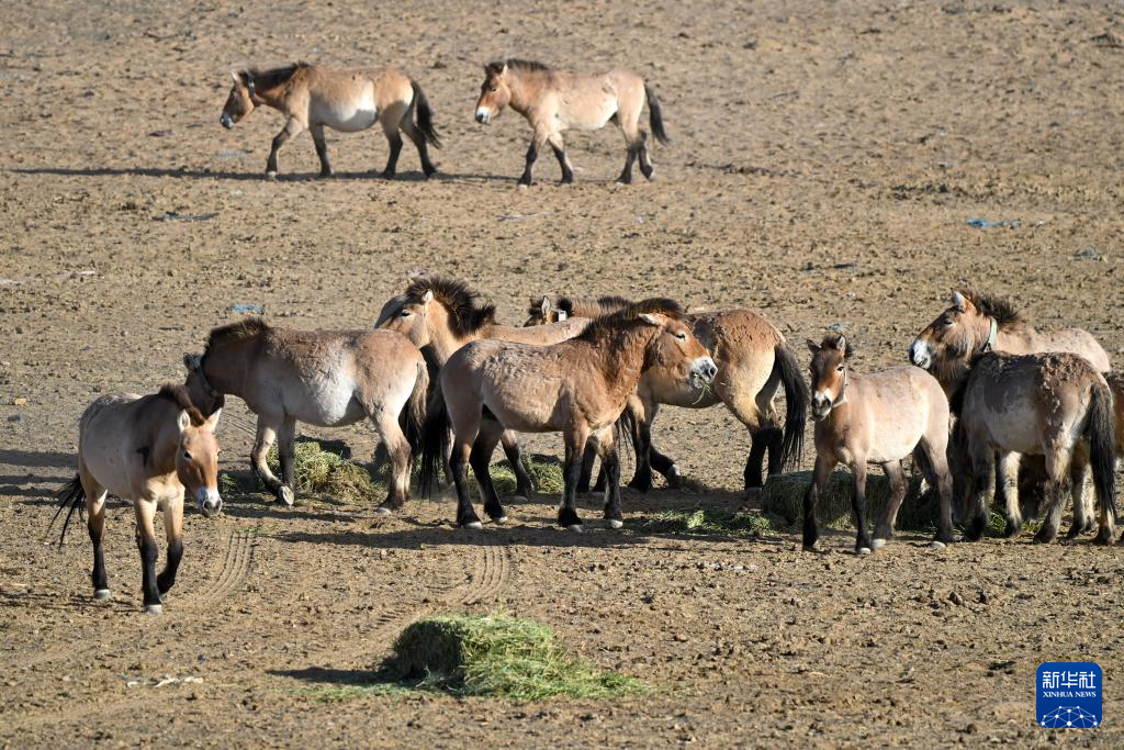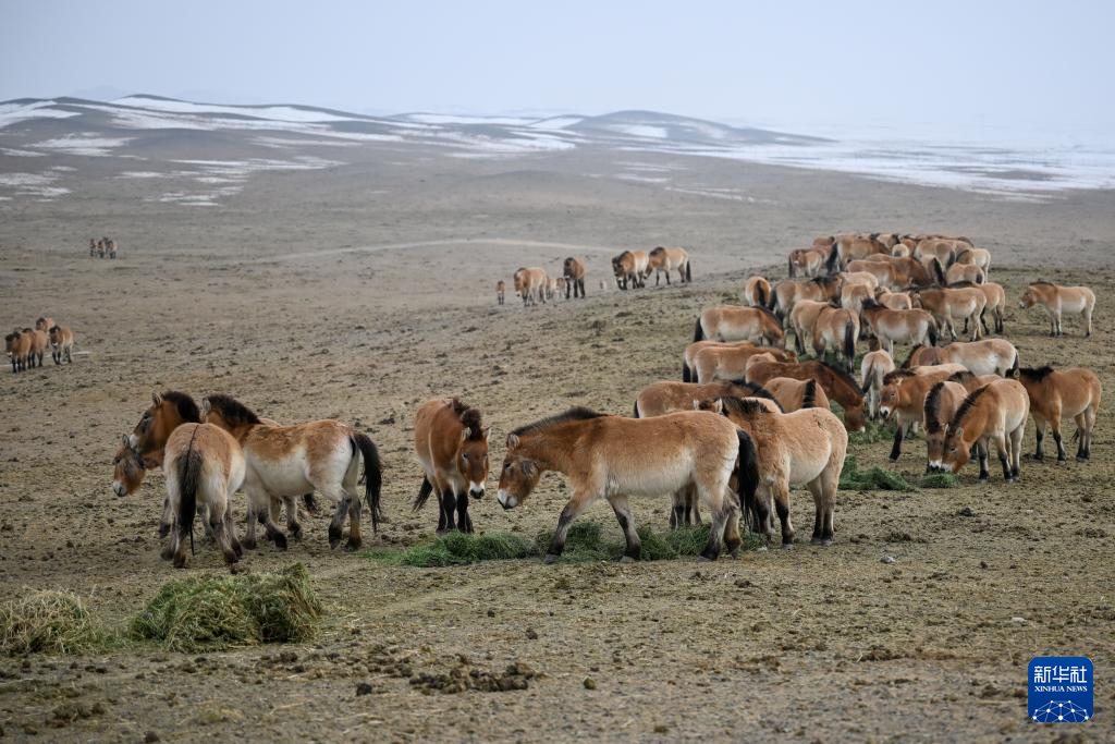 在新疆卡拉麦里山有蹄类野生动物自然保护区,工作人员为普氏野马投放草料(4月21日摄)。