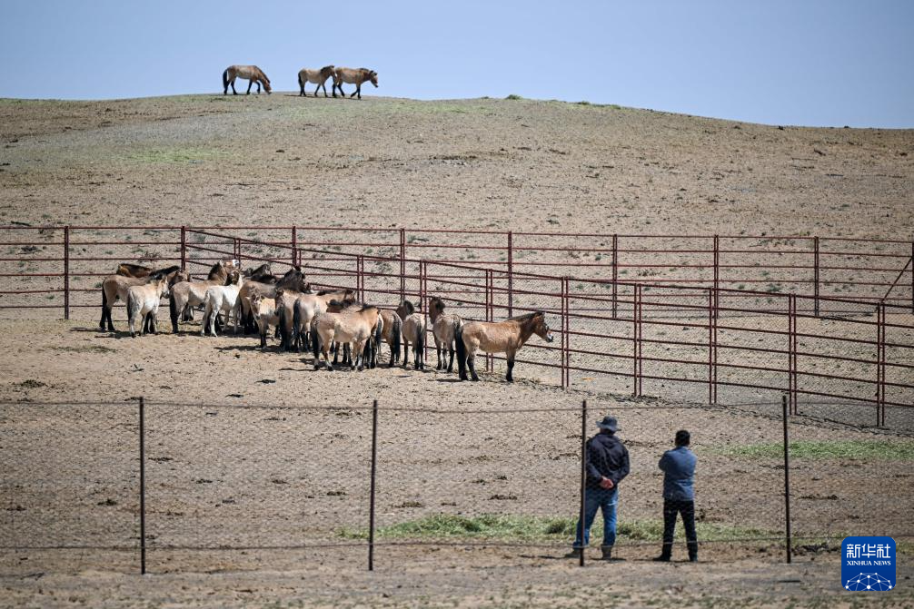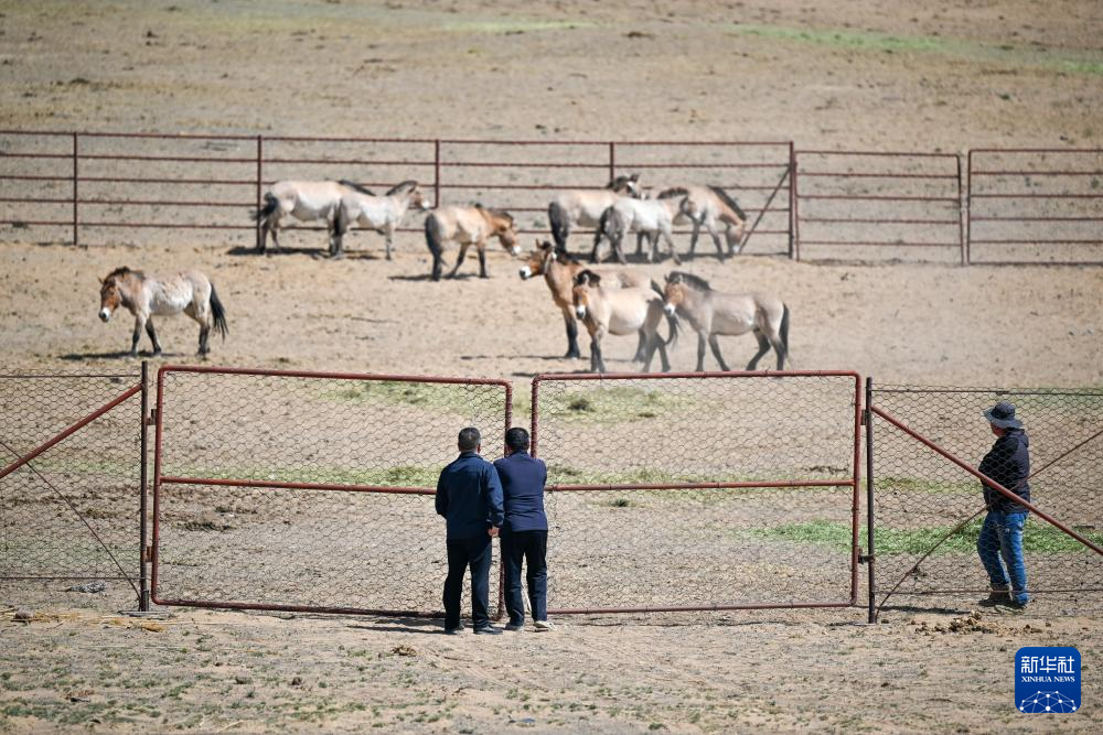 在新疆卡拉麦里山有蹄类野生动物自然保护区,工作人员在观察即将野放的普氏野马状态(4月22日摄)。