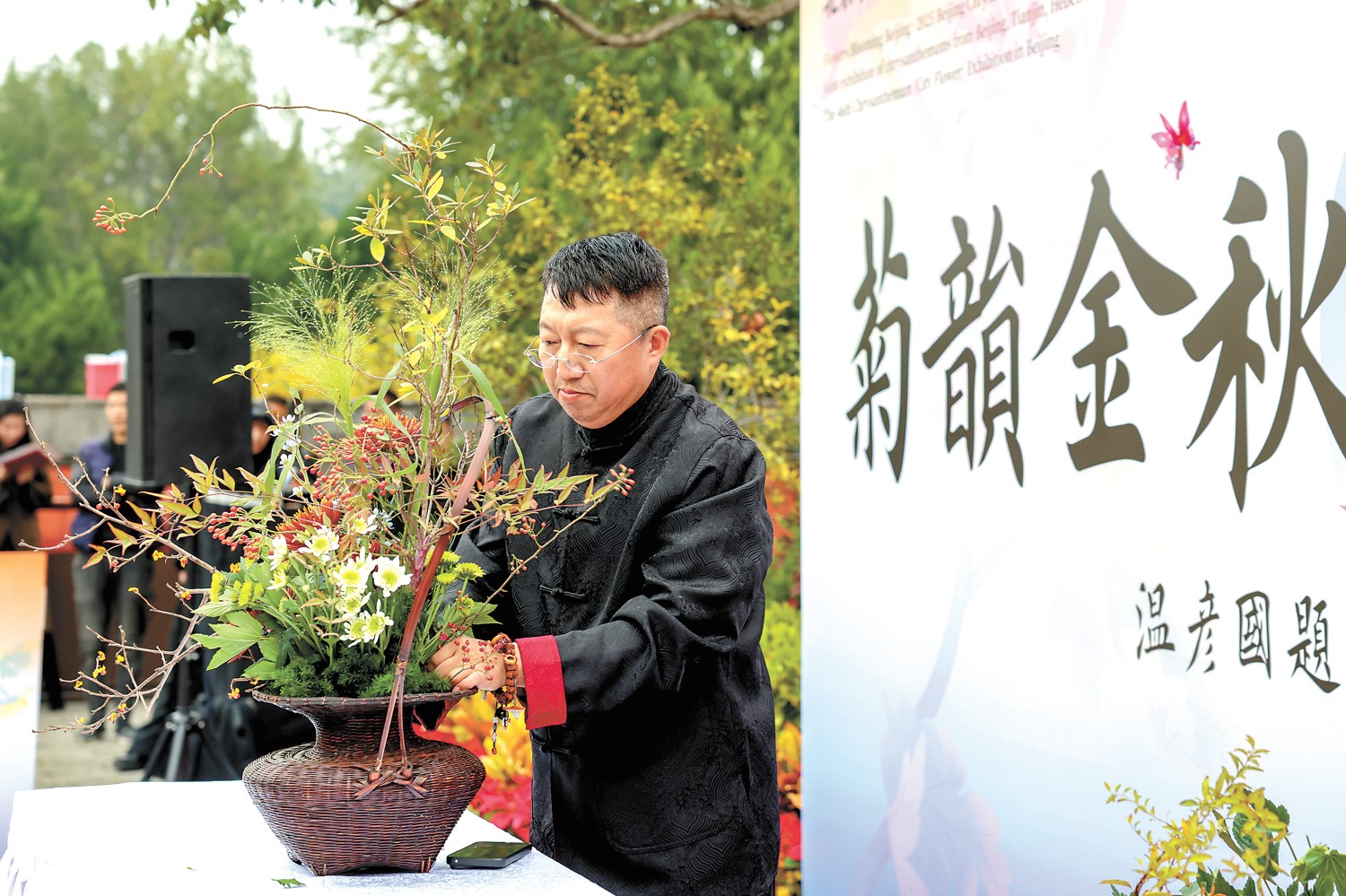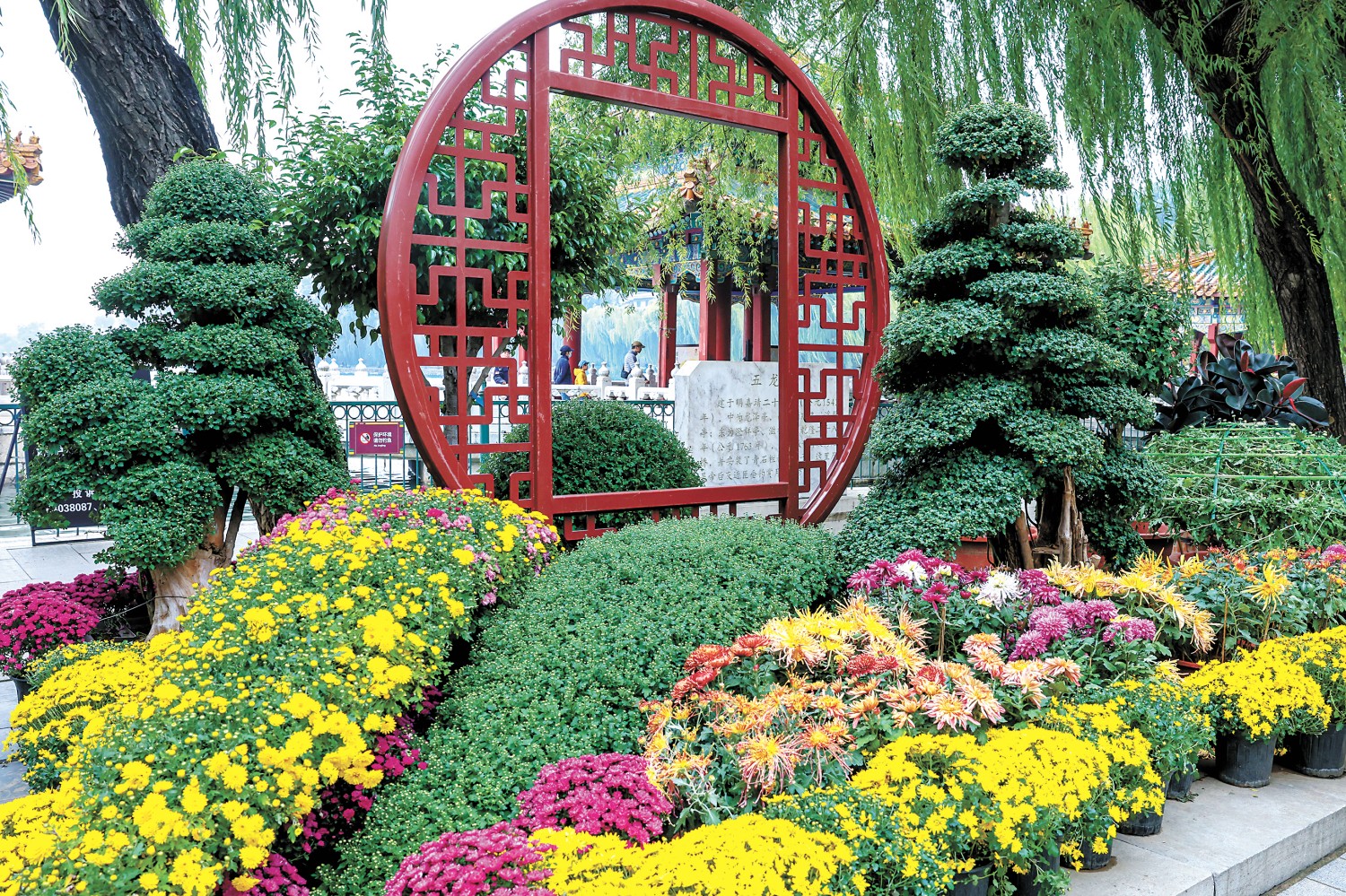 北海公园作为活动主会场,全园布置花坛花境,形成一步一景、一景一韵的沉浸式赏菊体验。展区覆盖全品类菊花展示矩阵:室外景点将菊花与琼华岛、太液池等标志性景观自然融合,营造人在画中游的诗意氛围;标准展台按花色、花型陈列精品菊花,尽显栽培特色;特色品类专区集中展示大立菊、悬崖菊、塔菊、造型艺菊等特色菊种,同步开展“菊韵百年”主题插花表演,搭配古筝演奏《菊花台》,让传统花艺与古典音律交相辉映。公园还推出《从御苑到公园——北海开放百年纪(1925—2025)》展览,使菊文化与百年园林历史相互交融、相得益彰。文创展区以“可带走的菊花文化”为理念,推出菊花茶、菊花酒等特色衍生产品。