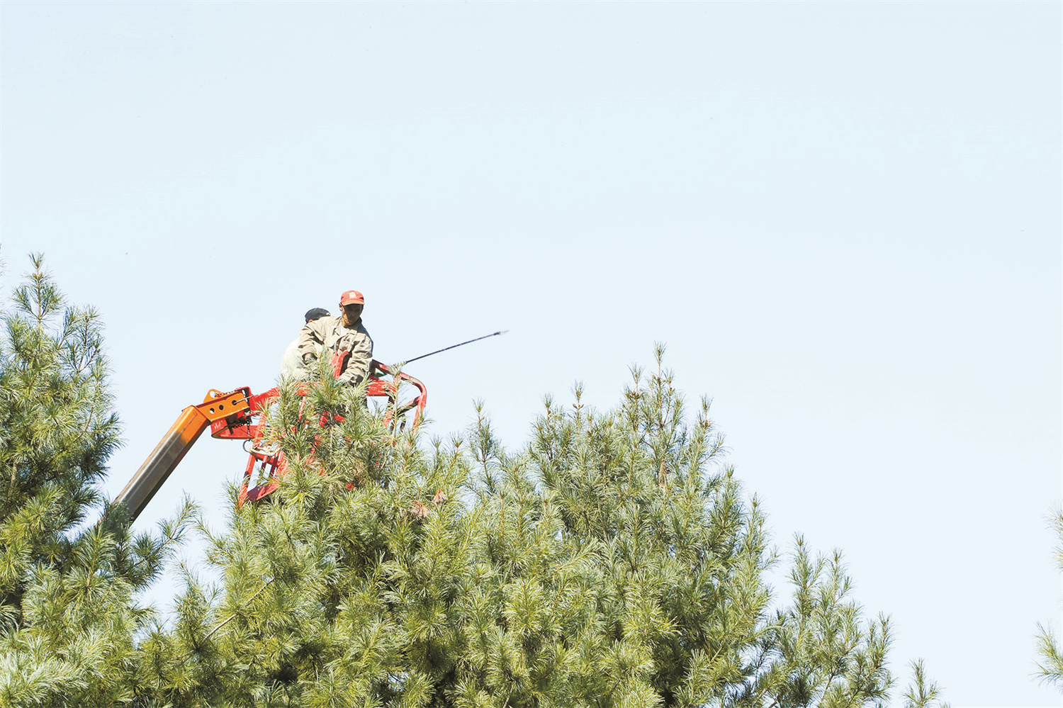 近日,在吉林省柳河县五道沟林场的红松母树林基地,一台链轨式升降机将两名工人举到红松顶端,工人通过操作手中的长杆把周围树上的松塔打落。这是吉林首次采用机械辅助人工采摘松塔。