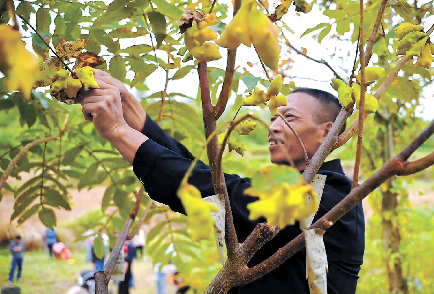“5号树,单株产量1.15千克!”9月21日上午,重庆市酉阳土家族苗族自治县南腰界镇南腰界村五倍子实收测产的人群中传出一阵欢呼声。没想到,这棵仅2米来高的盐肤木,靠小小蚜虫就能吸出这么大的挂果潜力。