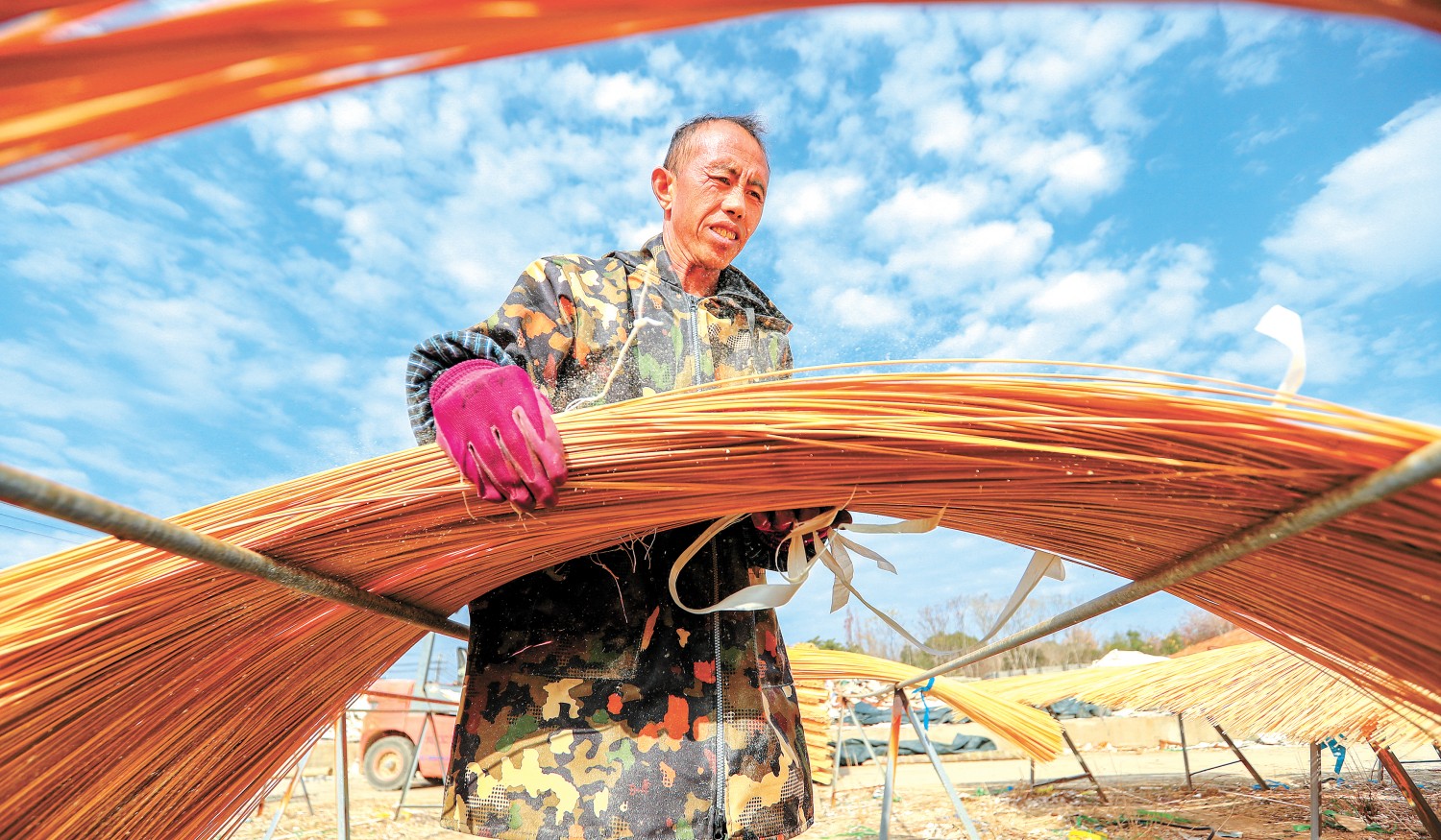 12月16日,长兴县泗安镇师姑岗村工人晾晒加工好的毛竹条。