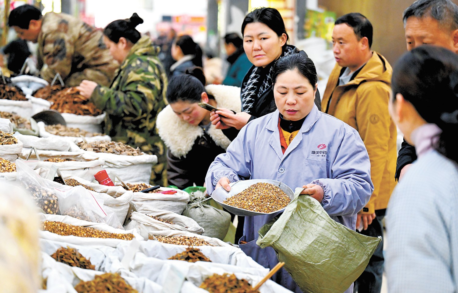 临近年末,安徽省亳州中药材专业市场内人头攒动,前来选购中药材的客商络绎不绝。亳州中药材专业市场上市品种多、经营面积大,是国内交易活跃的中药材专业交易市场。中药材日上市品种2800余种,日客流量6万人次。