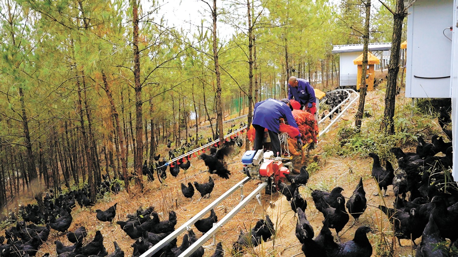 近日,在四川省万源市石塘镇百里坡旧院黑鸡生态农场林下养殖区,满山遍野的旧院黑鸡正在林间觅食,饲养员开着一辆“小火车”进行喂鸡、捡蛋。“轨道‘小火车’让养鸡效率大幅提升。”农场董事长刘晓岗介绍,养殖区在500亩山林放养3万只旧院黑鸡,新建3公里轨道串联92栋鸡舍后,管理人员从10余人减至2人,每年节省人工成本20多万元。