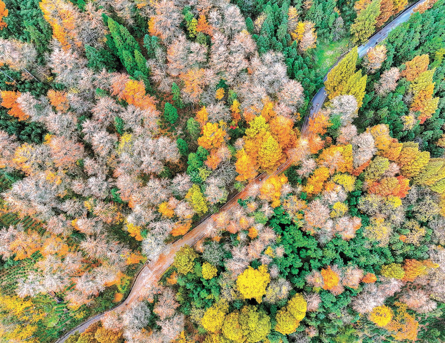 11月11日,浙江省湖州市安吉县山川乡九亩村,中国金钱松森林公园内5万余株金钱松叶片由绿转黄,与红枫、常绿树交织成五彩画卷,吸引众多游客前来休闲观光。 陈海伟 摄
