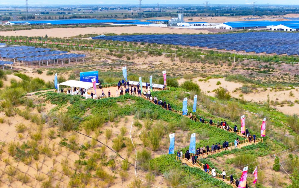9月16日,第十届库布其国际沙漠论坛与会者参观库布其沙漠鄂尔多斯中北部新能源基地先导工程(无人机照片)。(王正 摄)