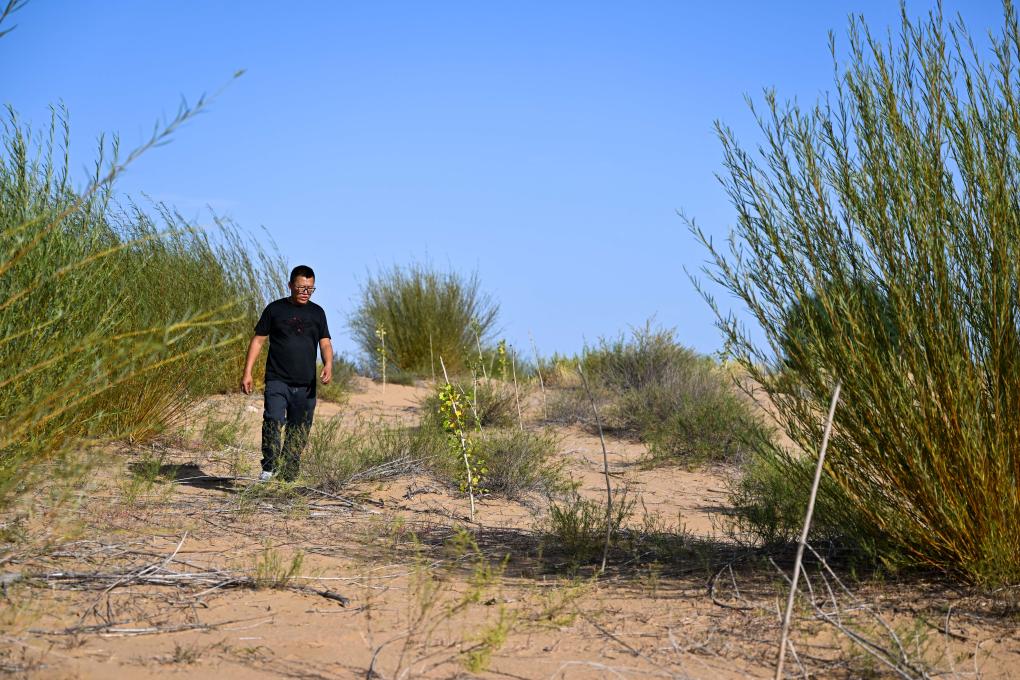 9月10日,冯慧在达拉特旗境内的库布其沙漠里查看沙生植物的生长情况。新华社记者 李志鹏 摄