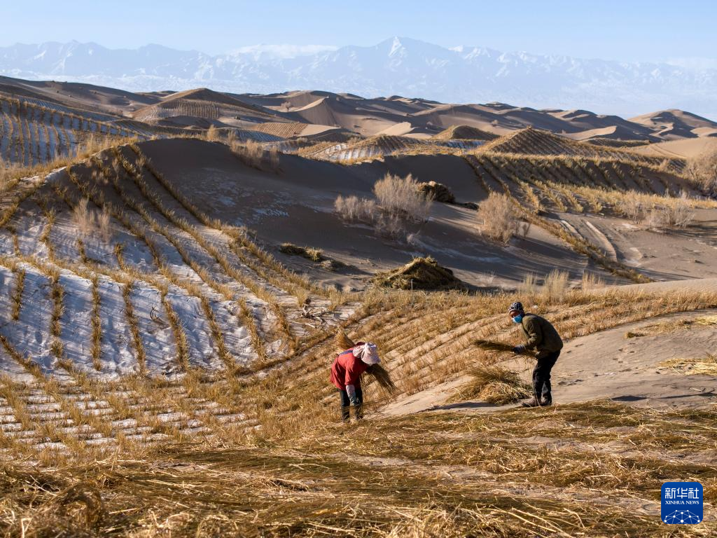 12月13日,施工人员在库姆塔格沙漠铺设沙障。