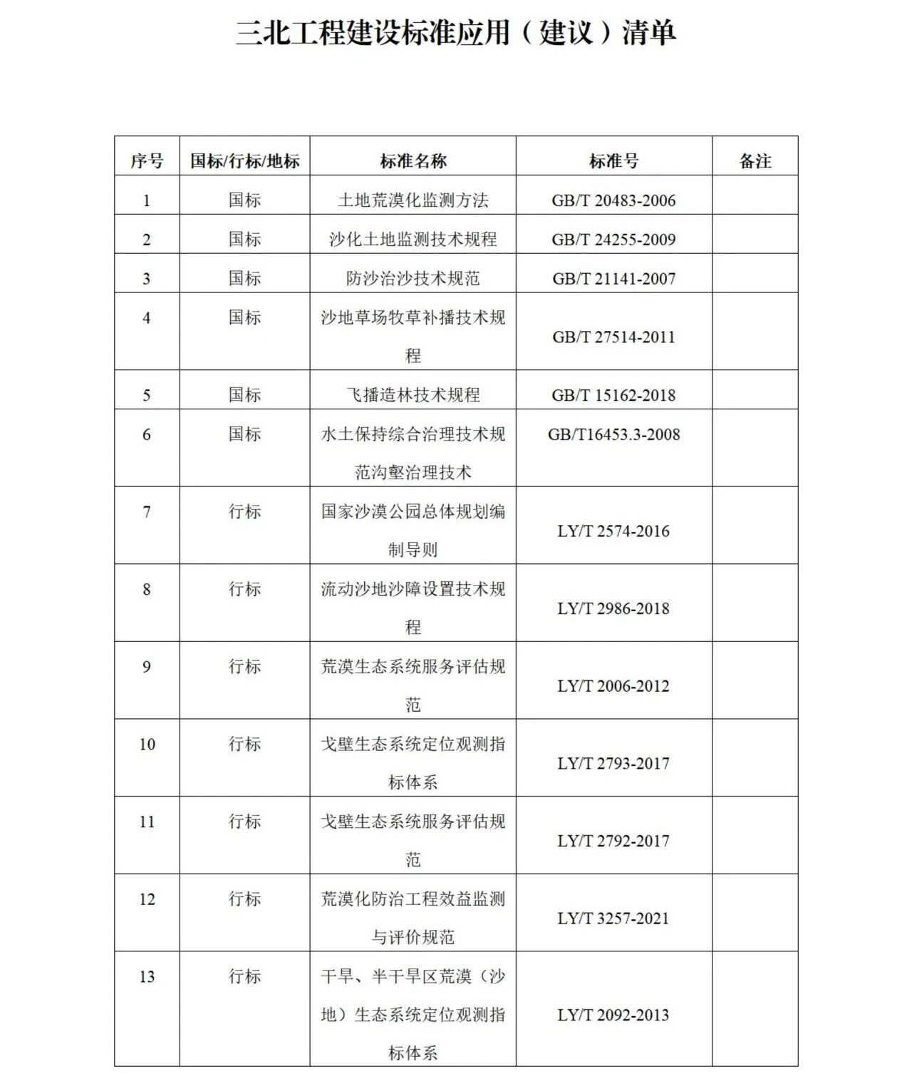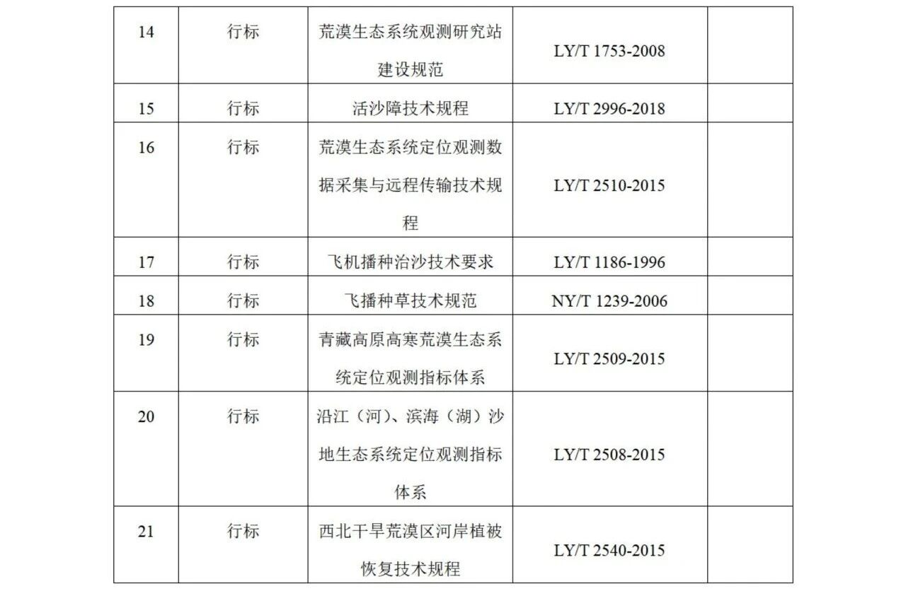 标准化的生命力在于应用。为了让一线人员便捷获取最实用的技术,标委会系统梳理并筛选出《防沙治沙技术规范》《流动沙地沙障设置技术规程》等21项现行“好用、管用”的标准,形成推荐清单供一线使用(清单附后)。同时,根据工程需求对标准体系进行动态更新与完善。2025年新增并立项《光伏场防沙治沙技术规范》《荒漠地区(沙漠、沙地和戈壁)光伏工程生态影响监测与评价》《干旱区盐渍化土地治理技术规范》等新标准。