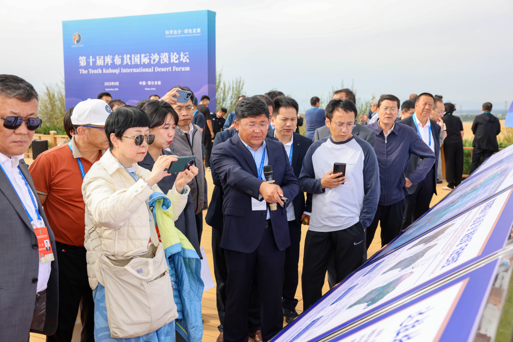 9月16日,在以路治沙示范区参观点,工作人员为第十届库布其国际沙漠论坛与会者介绍治沙植物。(赵鑫磊 摄)